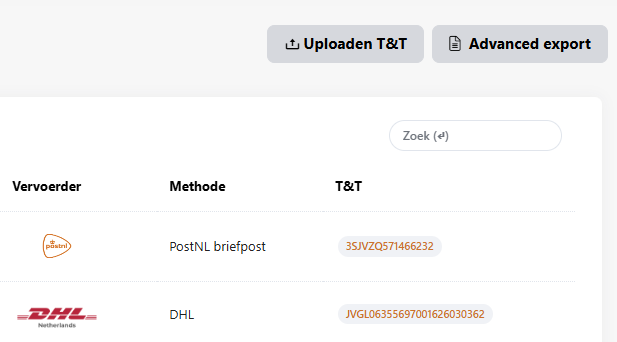 Wanneer je een verzending opent, wordt de bijbehorende Track & Trace-code van het pakket weergegeven.